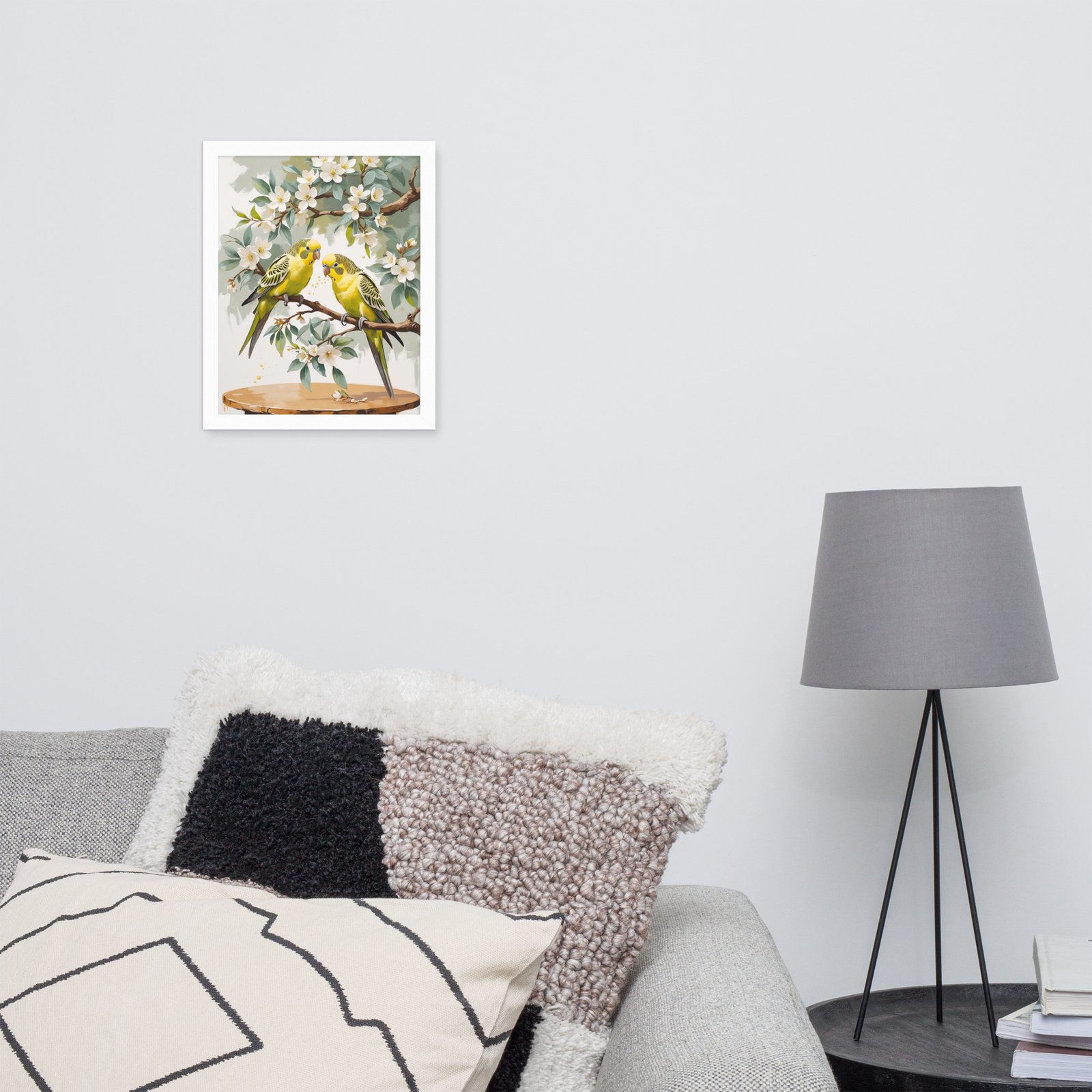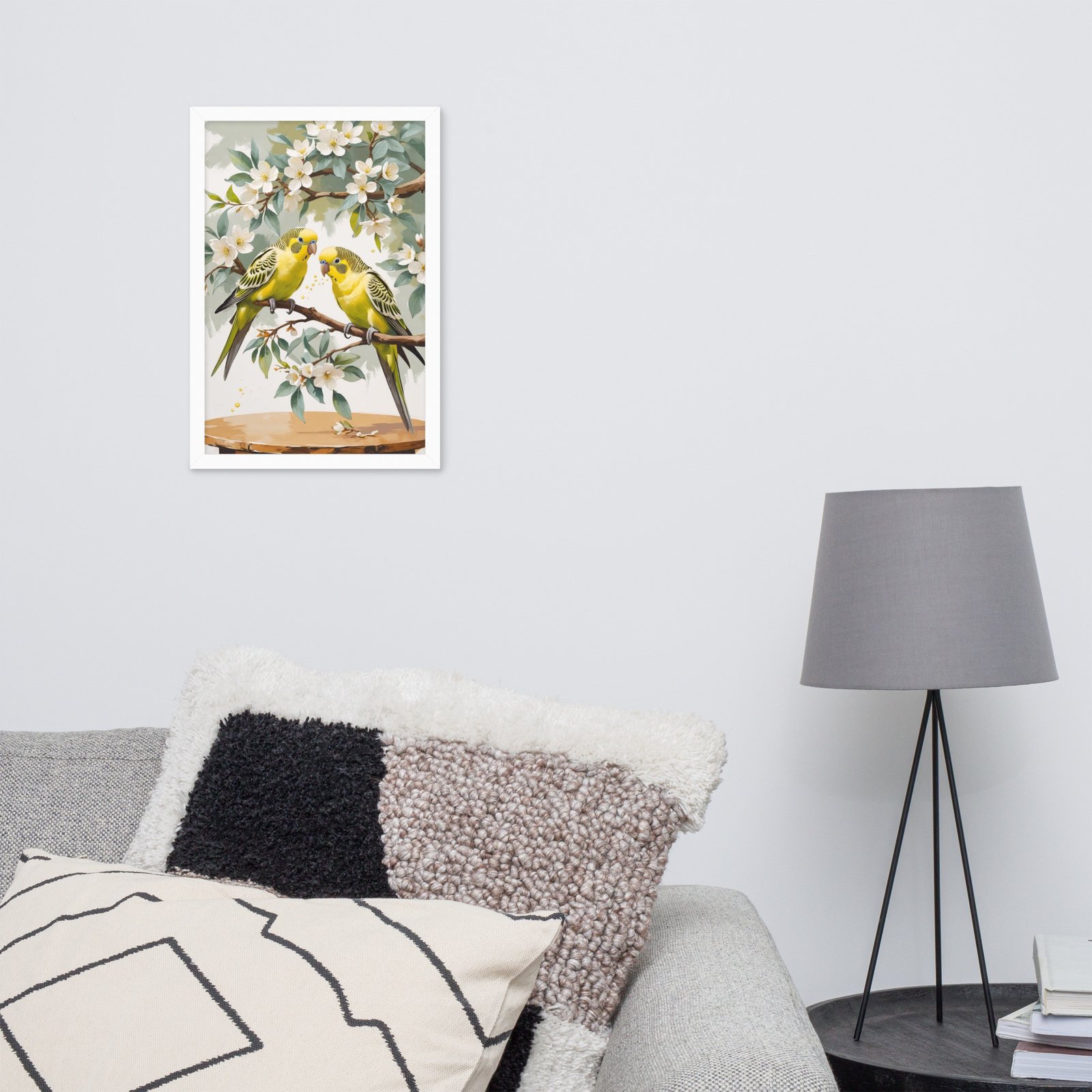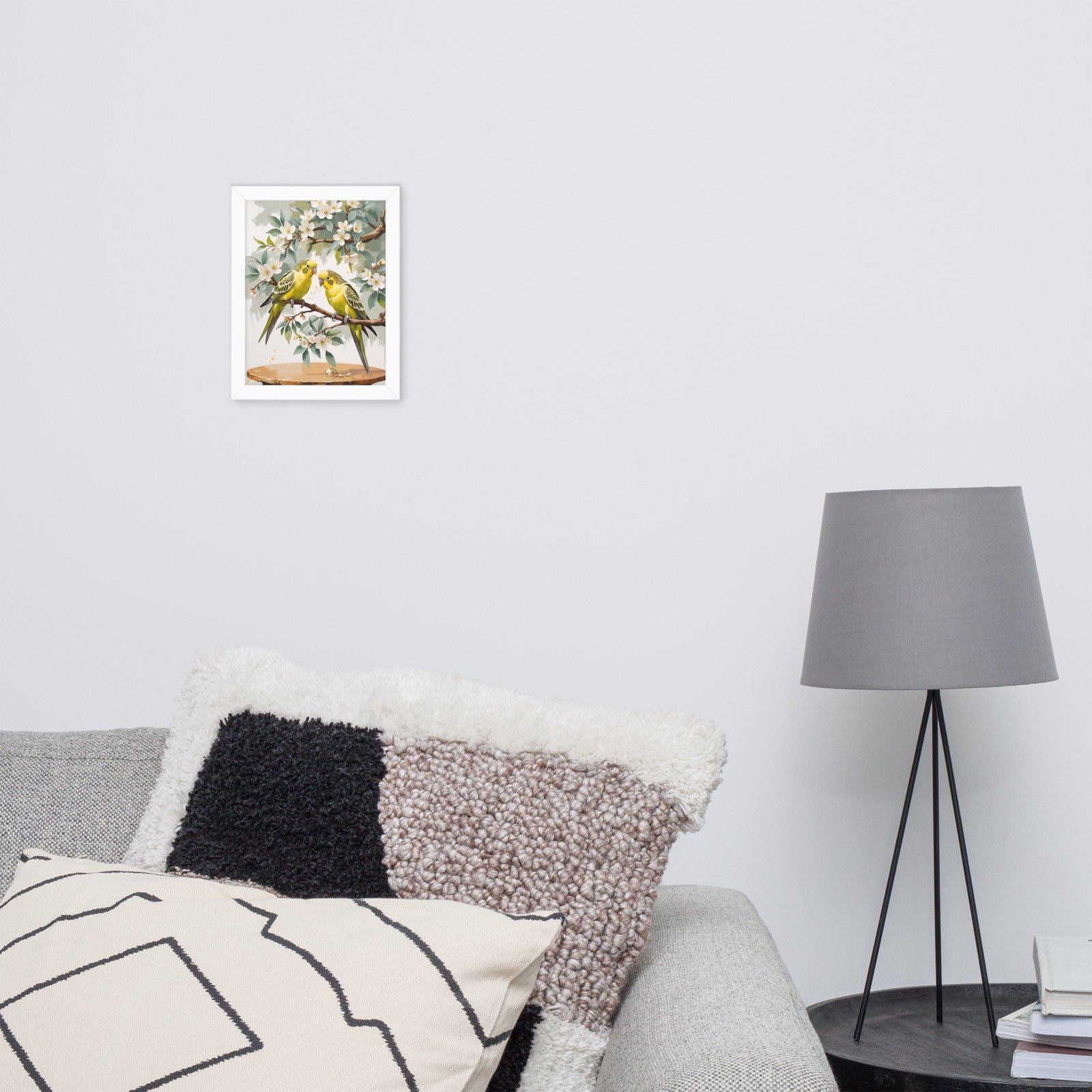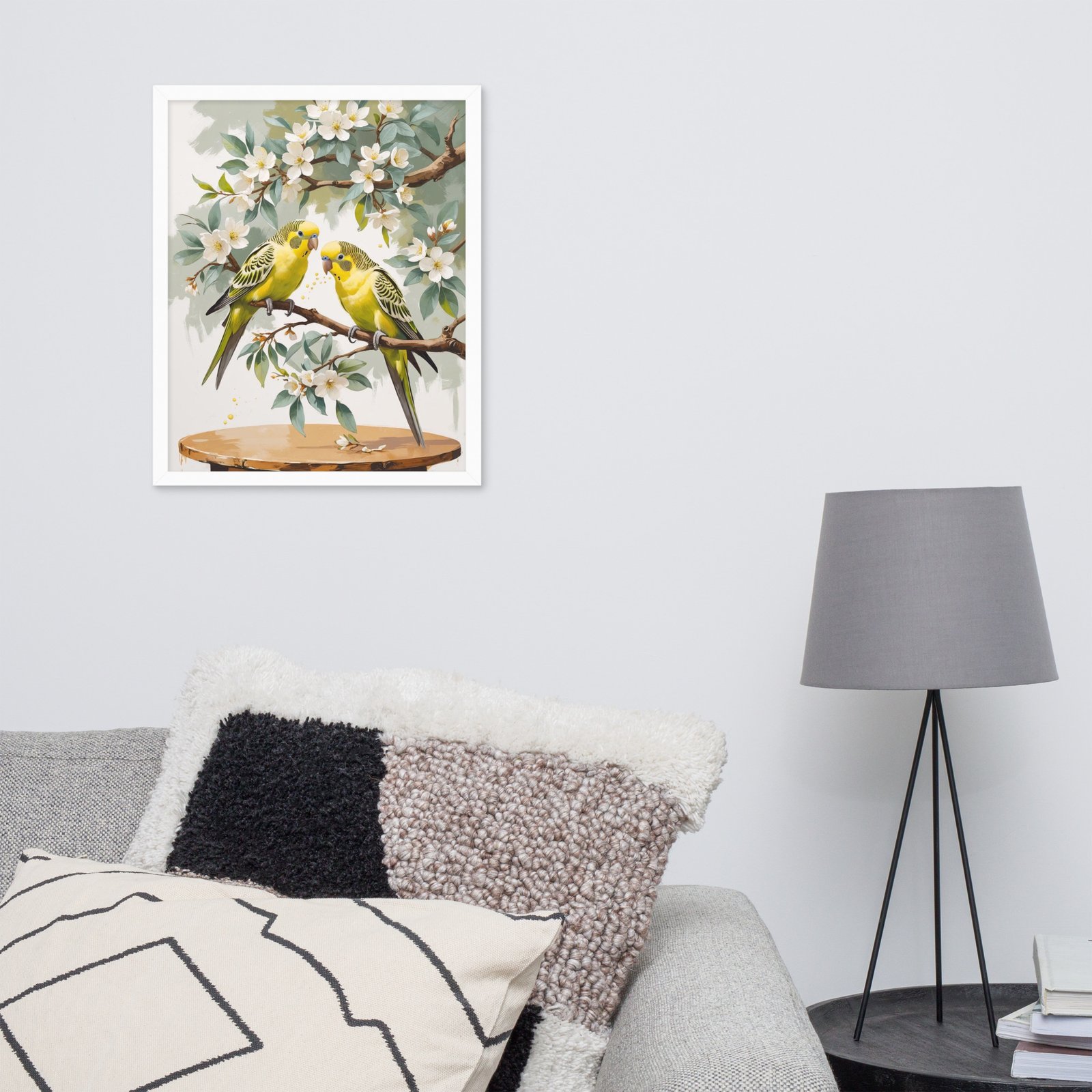 This framed poster features two curious parakeets perched among blooming pear branches above a rustic country table. Their bright colours play gently against the soft white blossoms, creating a lively yet peaceful springtime scene.