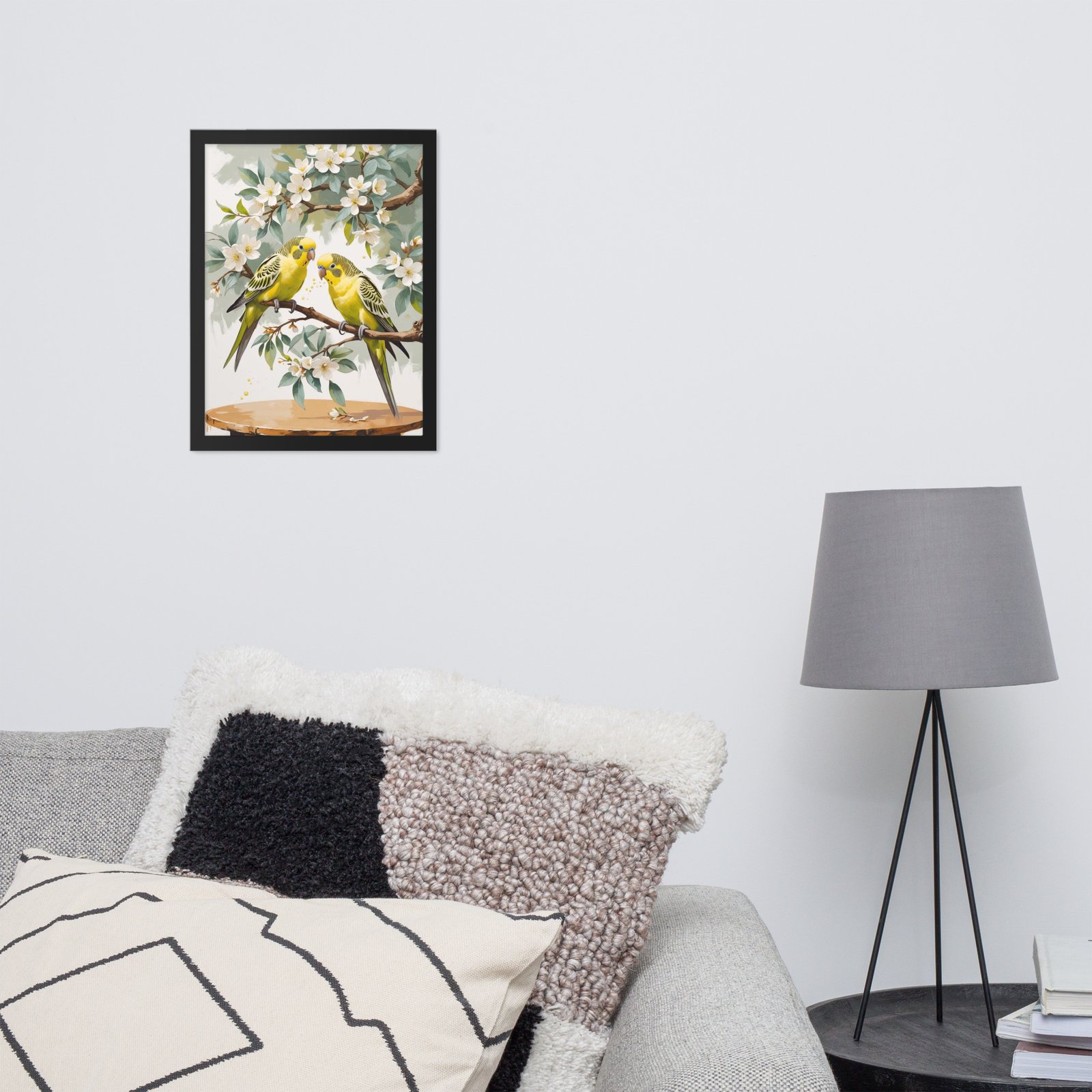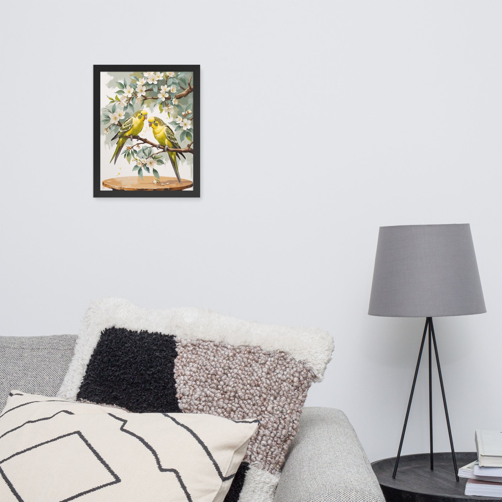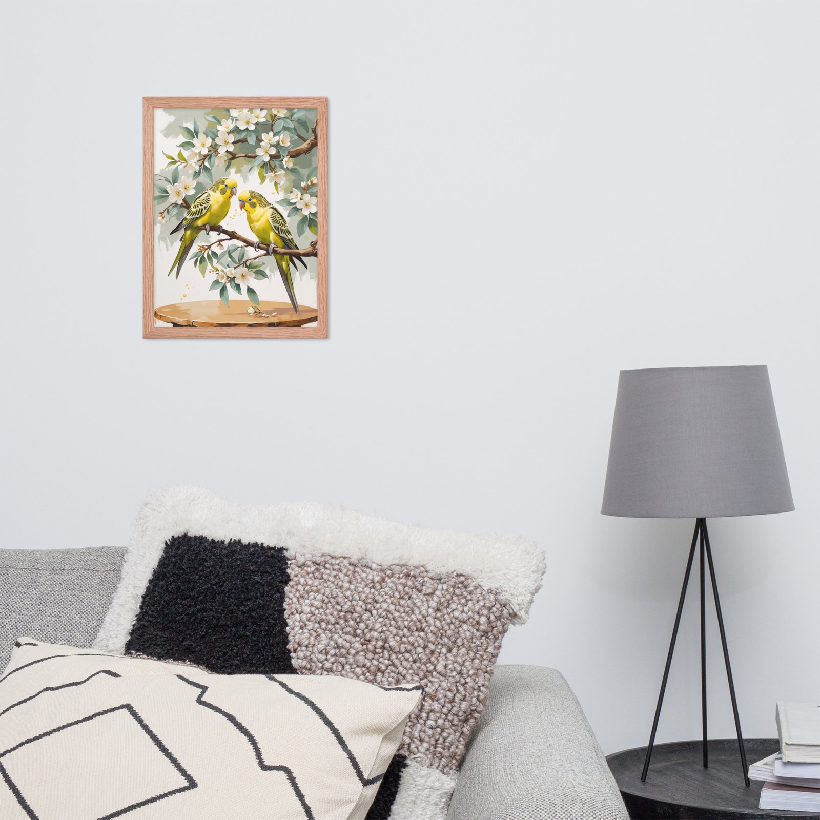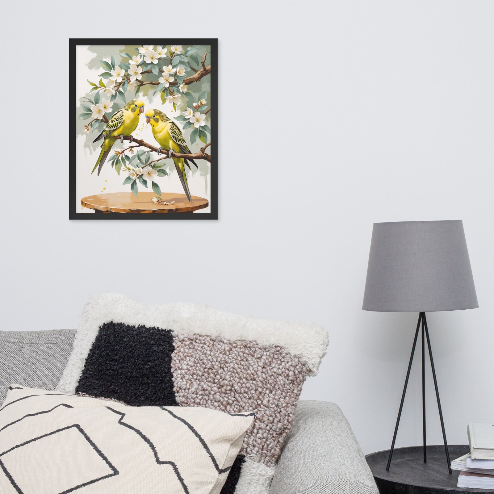 This framed poster features two curious parakeets perched among blooming pear branches above a rustic country table. Their bright colours play gently against the soft white blossoms, creating a lively yet peaceful springtime scene.