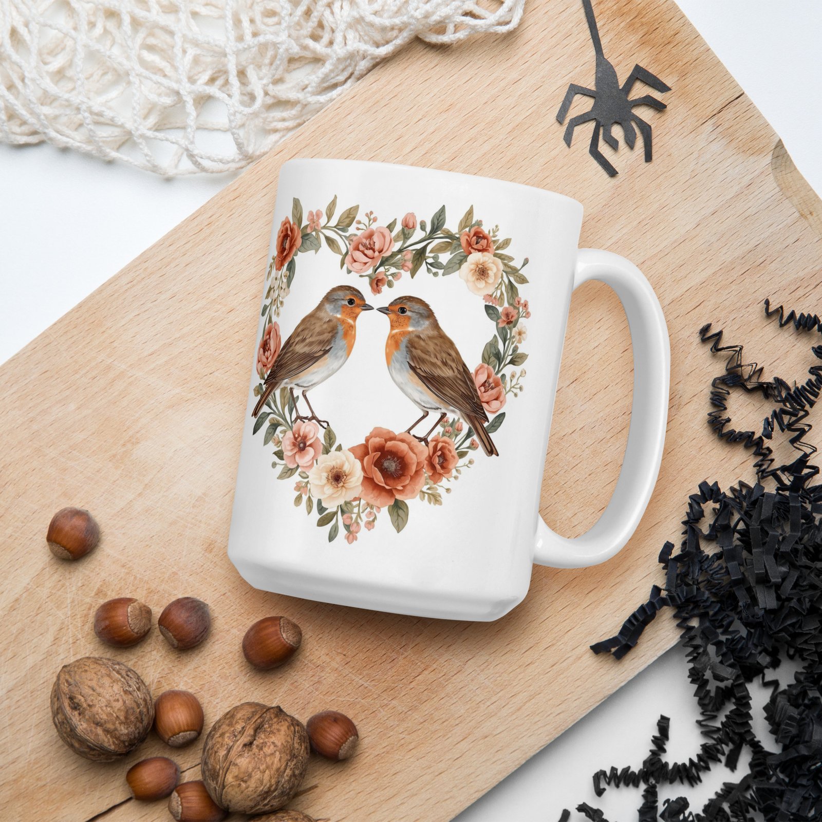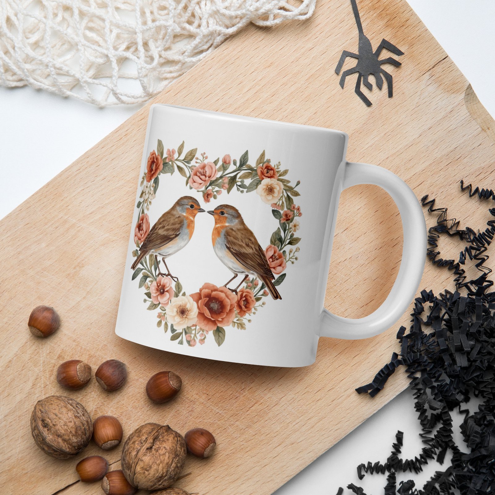 Encircled by delicate wildflowers, two robins share a tender moment in this botanical-inspired mug design. Perfect for cozy tea evenings and heartfelt Valentine’s gifting.